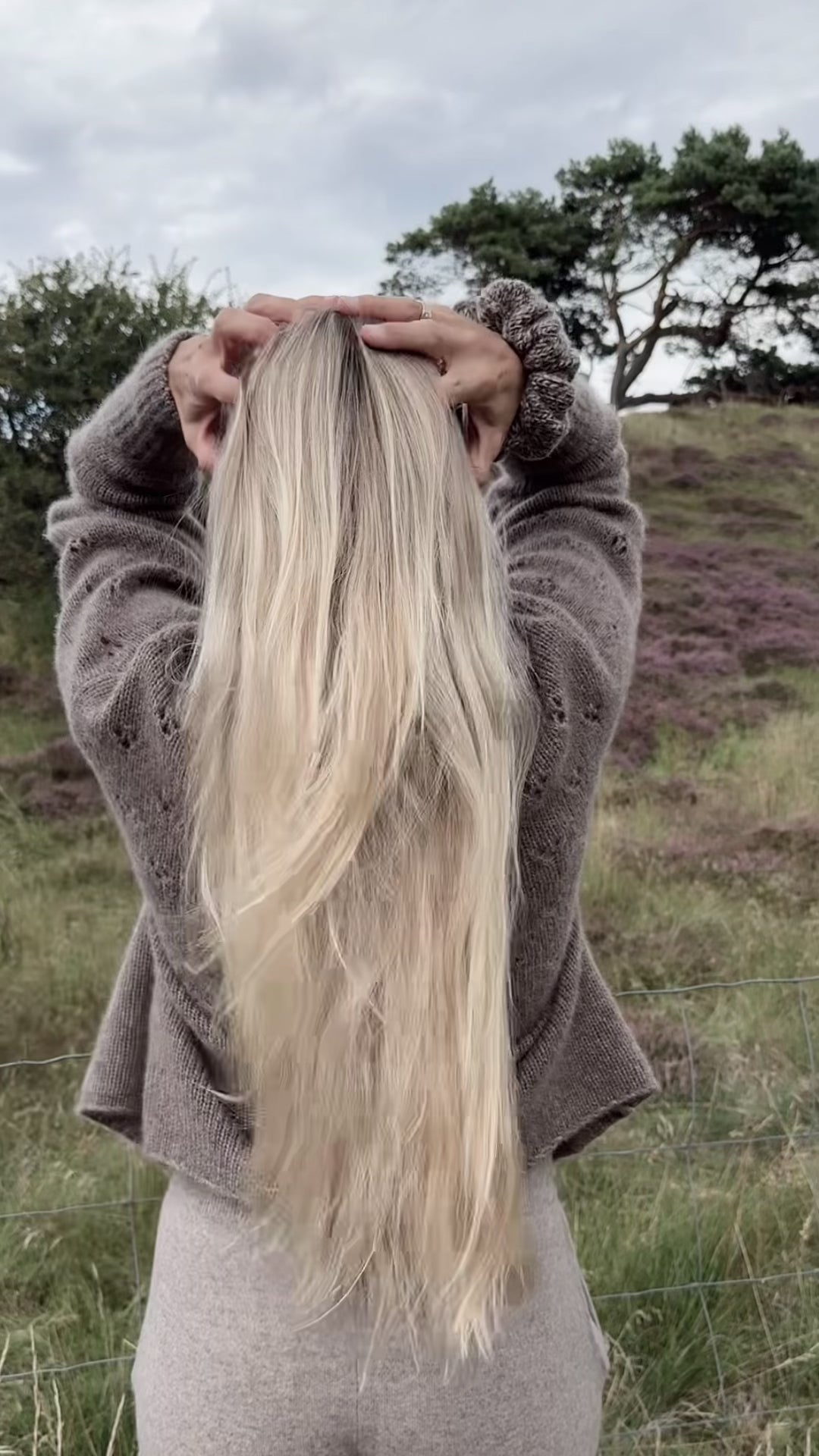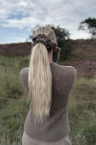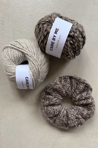 Gift yourself a quiet pause – let your hands find their rhythm and knit a beautiful scrunchie in our soft, recycled luxury yarn from Italy. A simple, cozy project that turns a small amount of yarn into a timeless, elegant hair accessory in just a few hours – inviting a quiet moment of self-care, where the pace softens and presence returns.