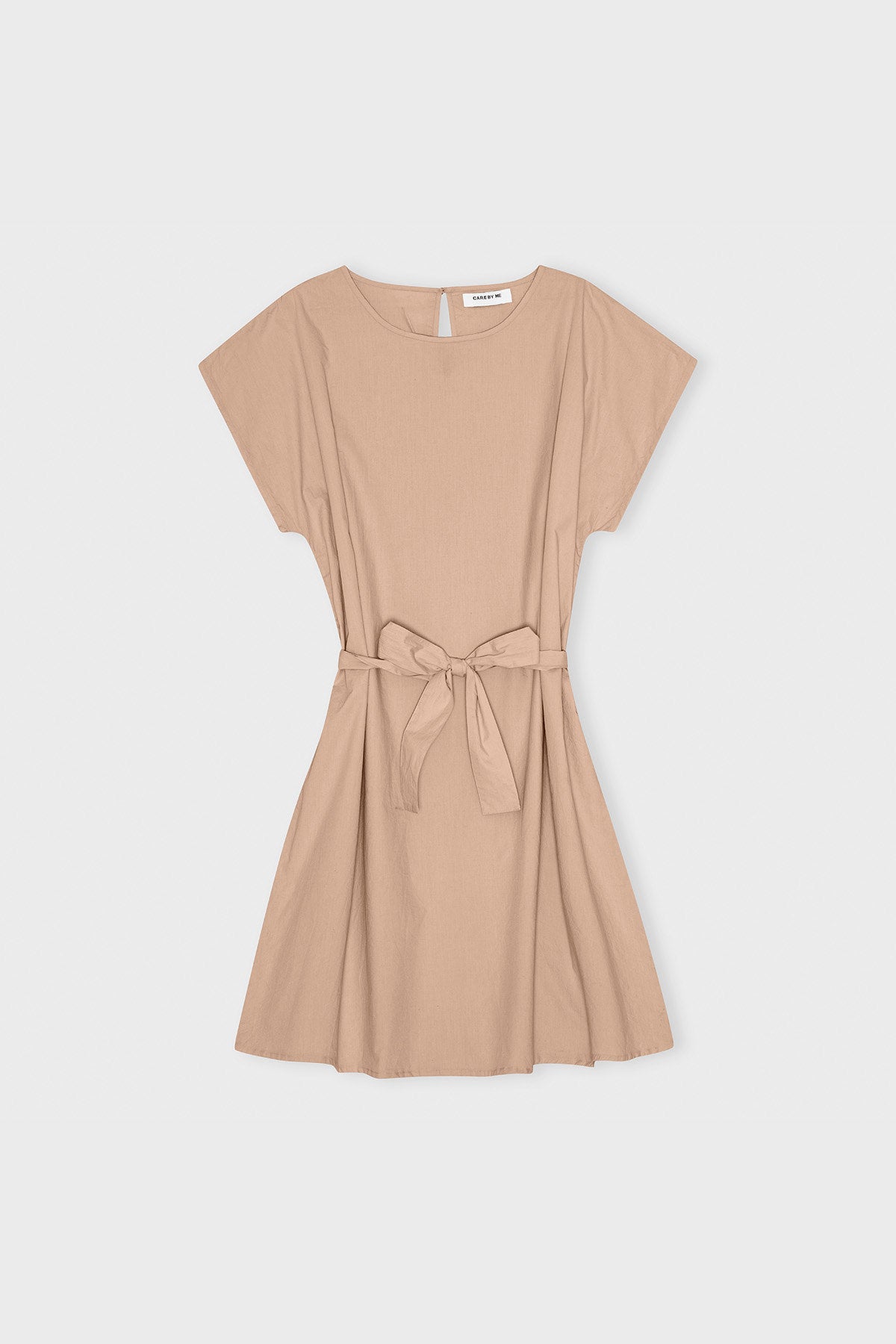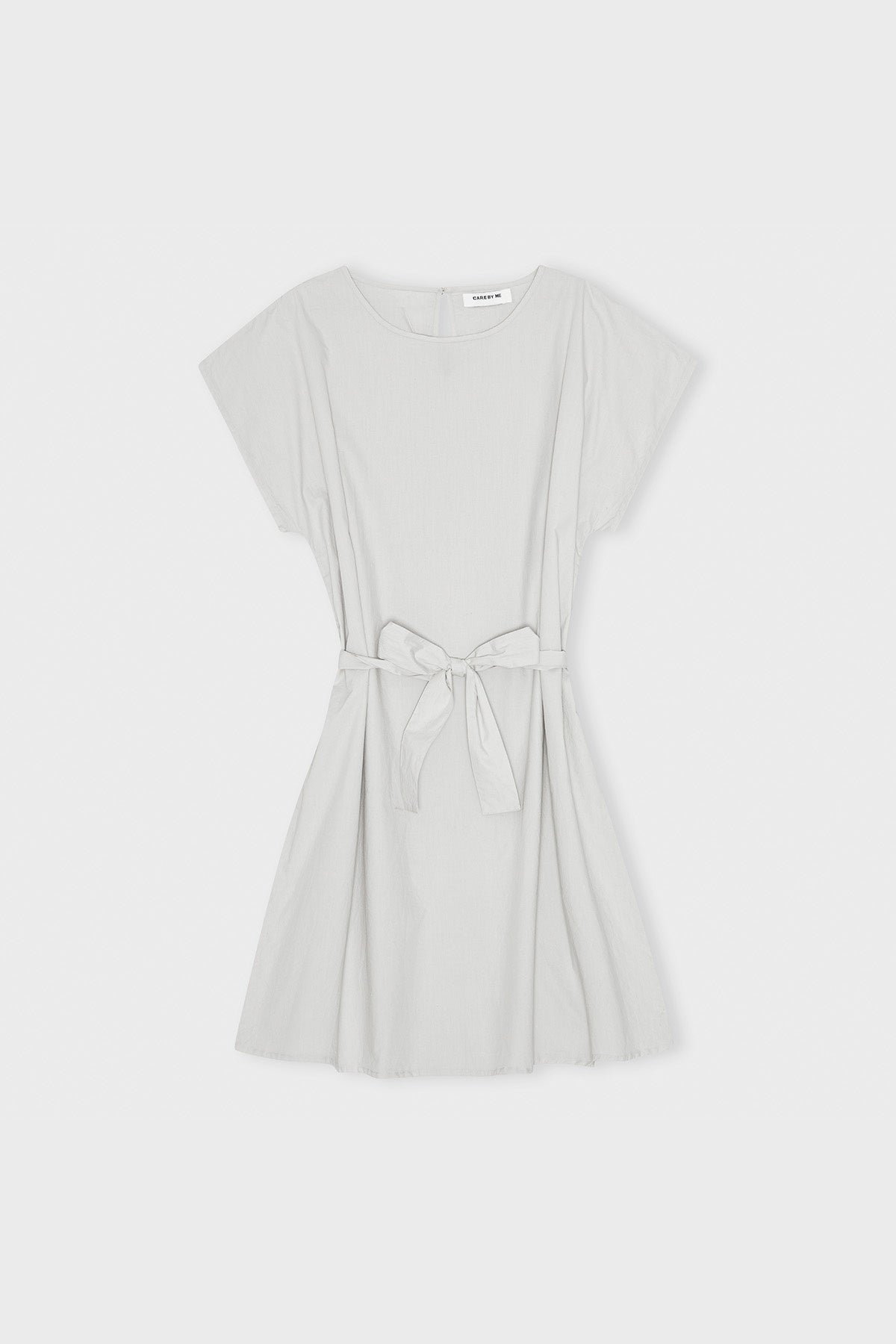 The tunic features a tie belt at the waist, a feminine cut with soft shoulders, and an elegant length falling just below the knees.